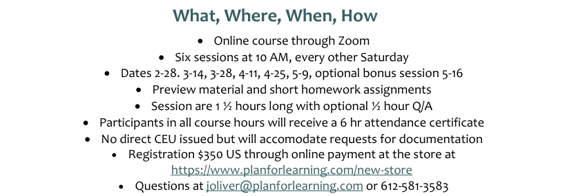 Janet Oliver and I are excited to announce that our long-awaited course is here! The bi-weekly online course beginning February 28th runs for 6 sessions with a 7th bonus session for those who want to participate. The classes are 90 minutes with an optional 30-minute Q&A opportunity directly afterwards. Registration and a FAQ page can be found at Janet’s website planforlearning.com. Please feel free to contact Janet or myself at SenseEnabled@gmail.com for more information. Come join us for a lot of learning and a little laughter!